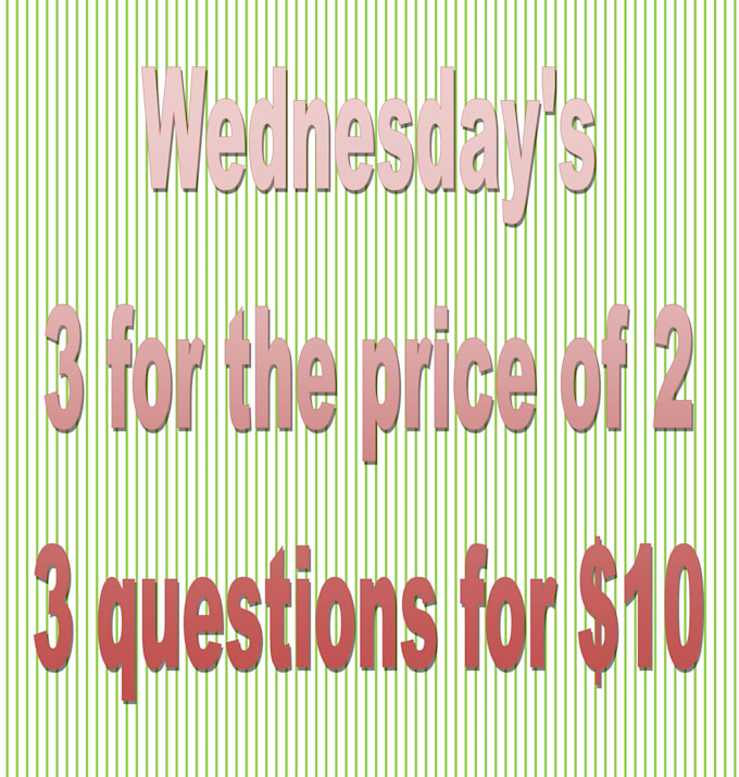 THIS IS A WEDNESDAY ONLY GIG - 3 QUESTIONS FOR THE PRICE OF TWO - JUST $10If you order before or after WEDNESDAY you will be given a request to extend your delivery for THE NEAREST wednesday regardless of days between. THIS IS STRICTLY A HUMP DAY (WEDNESDAY SPECIAL)
